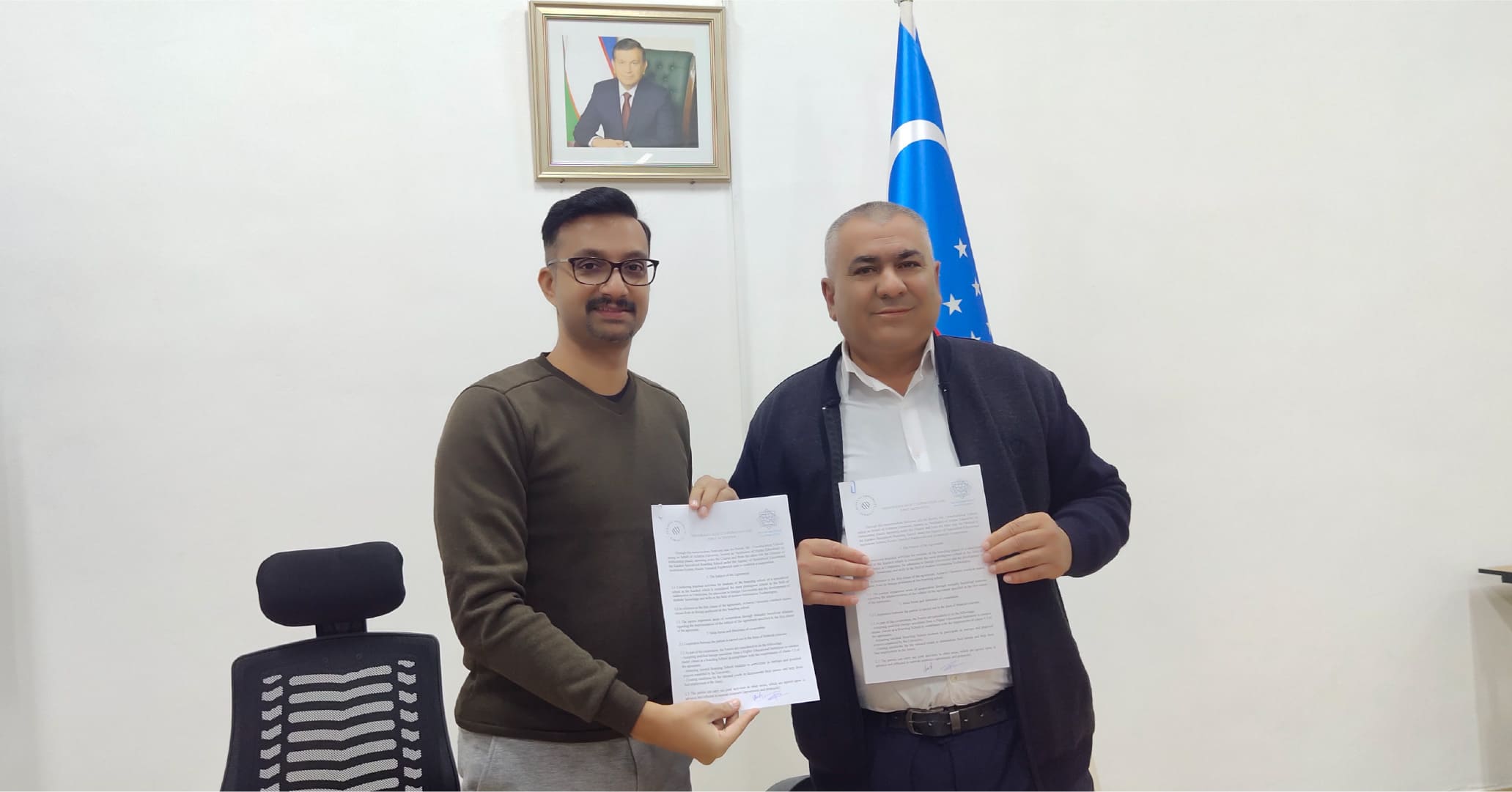The rector, Mr. Chandrashekar Vishesh of Acharya University, Karakul, Uzbekistan, signed a Memorandum with Ruziev Temirkul Rajabovich, Director of Karakul Specialized Boarding School, which is considered to be the most prestigious school in the field of mathematics in Uzbekistan.
